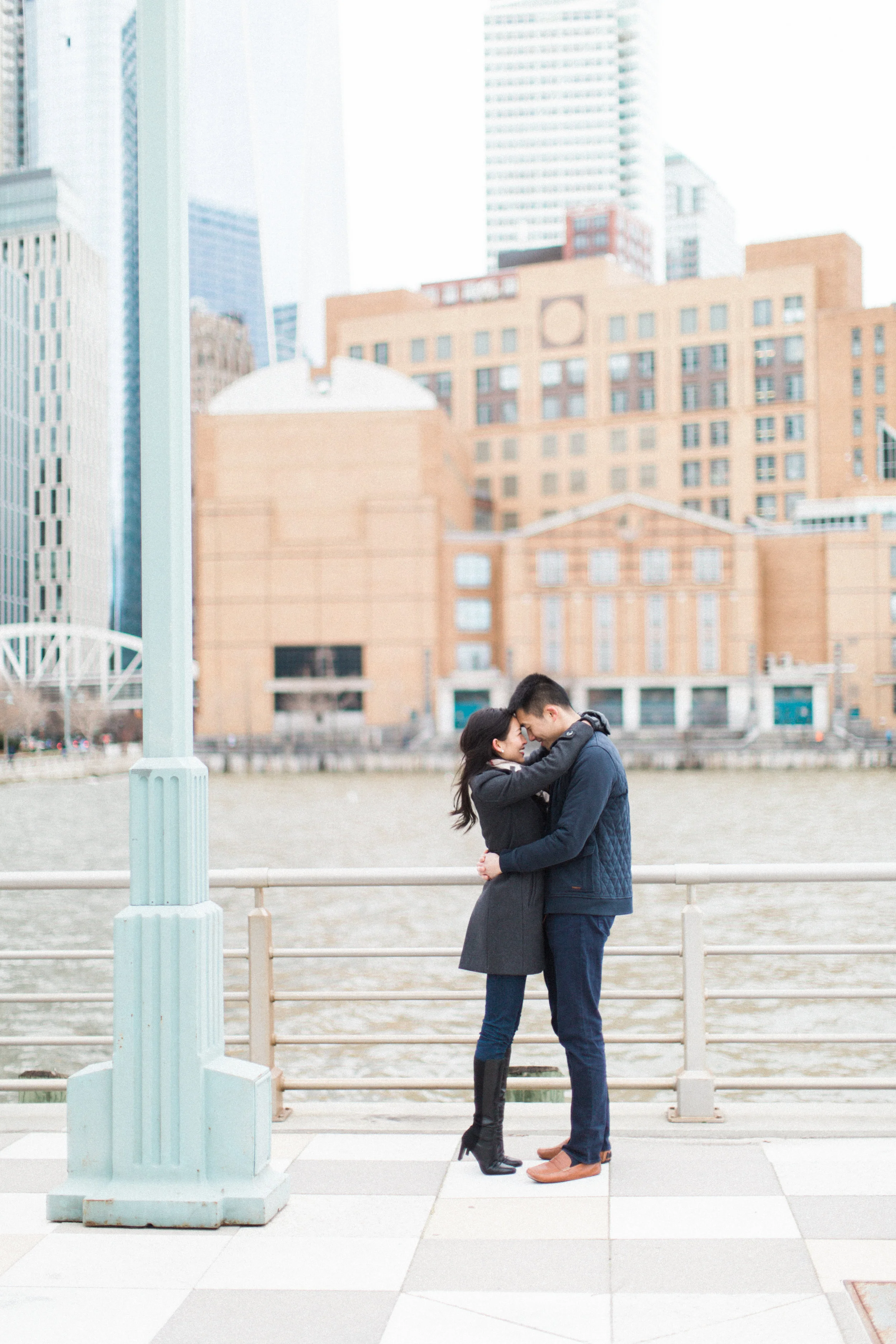 Jesse and Amy are some of the most pleasant people I have ever spent a morning with. Though the wind was crazy and it was beyond chilly towards the end, these two kept the cute moments and smiles coming throughout the shoot. Their love is so evident and it was so wonderful getting to capture them in the place they met and spent years together! They now live in the amazing city of Boston, in fact this shoot almost didn't happen due to a crazy snowstorm friday night. All flights and trains were cancelled and just when we thought it was impossible, they rented a car and began the trek to NYC. Honestly these two would look beautiful anywhere, but it was so special to have them take us around "their" spots. Washington Square Park was equally as stunning as it was quaint with the gorgeous arch, sweet benches and surrounding NYU buildings. Pier 40 was where the cold caught up with us but oh wow those views! This shoot was such a privilege and it gave me a whole new appreciation for NYC beyond the famed times square. I just love these guys so much and can't wait for their beautiful June wedding at the Cricket Club!